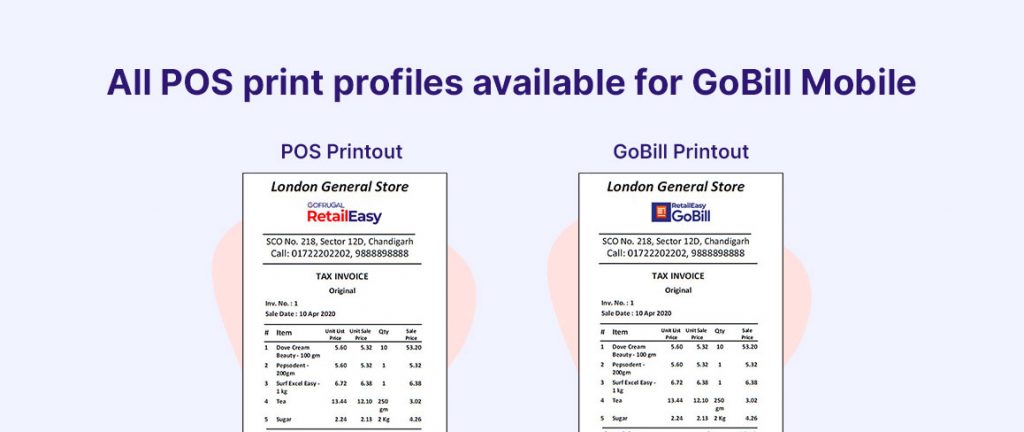 Our Mobile billing application GoBill Mobile also supports bill printing templates available in our Gofrugal POS. You can use any print profile template from POS through GoBill Mobile with printer size matching the POS and when connected via USB or Bluetooth.