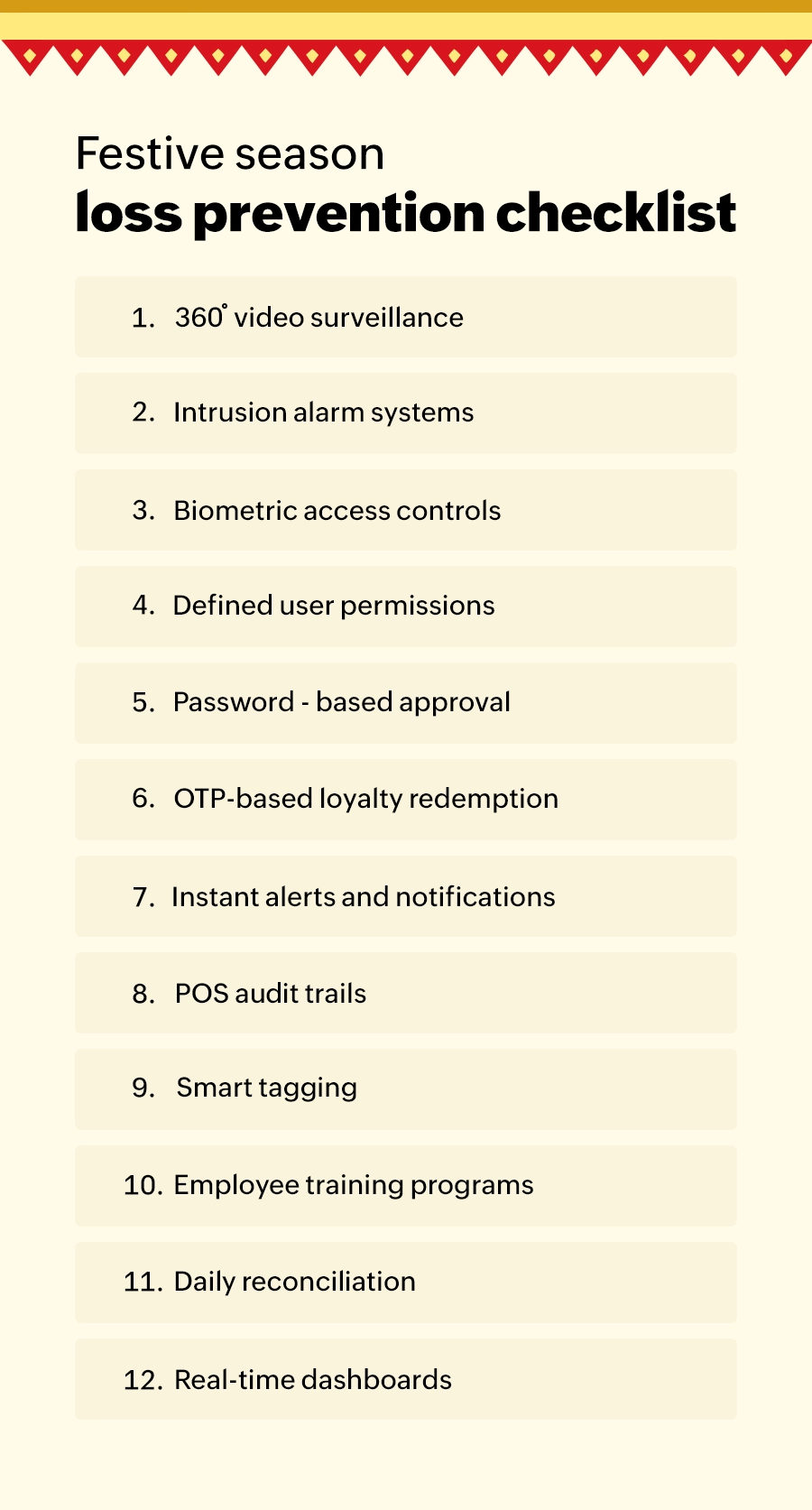 Increased footfall is great for sales; it’s also when your business is most vulnerable to theft and fraud. Finally, all business tends to get this profit boost, and as a cautious business owner, one should keep an eye on all of the above-mentioned threats and take proactive measures against them. The good news is most of the common and continuous thefts and frauds can be controlled if you are able to tick all of the above checkboxes in the checklist given.