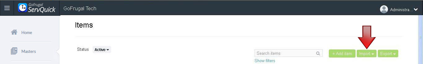 1. Select Masters > Item . An Items screen is displayed. Select Import.
