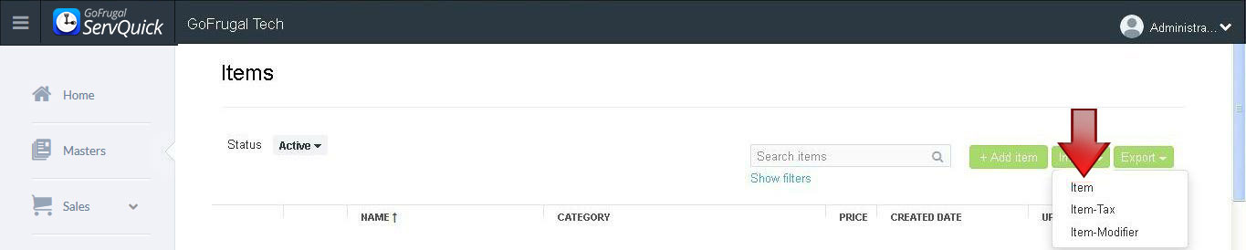 1. Select Masters > Item. An Items screen is displayed. Select Export